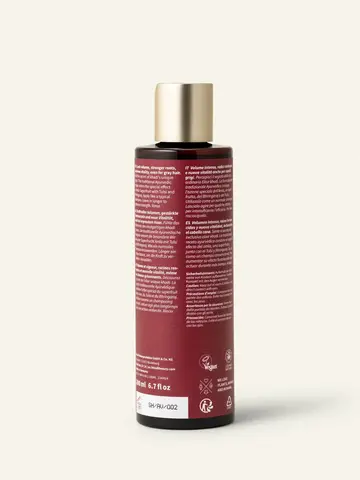 Состав: Aqua, Coco Glucoside, Lauryl Glucoside, Glycerin, Sodium PCA, Emblica Officinalis Fruit Extract (Amla), Ocimum Sanctum Leaf Extract (Tulsi), Aloe Barbadensis Gel (Aloe Vera), Bacopa Monniera Leaf Extract (Brahmi), Eclipta Alba Leaf Extract (Bhringaraj), Lawsonia Inermis Leaf Extract, Glyceryl Oleate, Sodium Cocoyl Glutamate, Caprylyl/Capryl Glucoside, Sodium Citrate, Citric Acid, Cananga Odorata Essential Oil (Ylang Ylang), Azadirachta Indica Leaf Extract (Neem), Sapindus Mukurossi Fruit Extract (Reetha), Acacia Concinna Pod Extract (Shikakai), Oryza Sativa Oil, Xanthan Gum, Hydrolysed Sweet Almond Protein (Mandelprotein), Hydrolysed Wheat Protein (Weizenprotein), Zinc PCA, Sodium Levulinate, Potassium Sorbate, Azadirachta Indica Oil, Benzyl Alcohol, Eugenol, Iso Eugenol, Benzyl Salicylate, Geraniol, Farnesol, Linalool, Benzyl Benzoate.